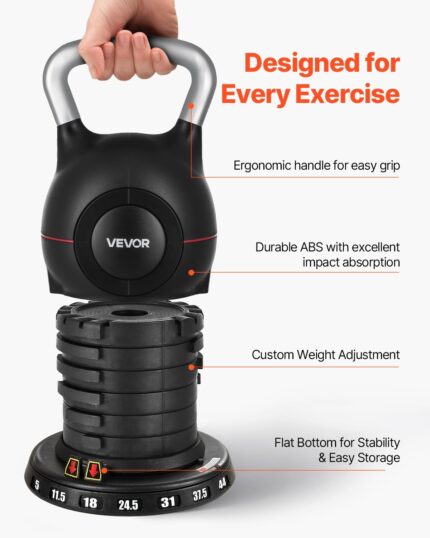 VEVOR Kettlebell, Adjustable Kettlebell with 7 Weight Levels (5,11.5, 18, 24.5, 31, 37.5, 44 lbs), Die-Cast Aluminum and ABSMaterial, for