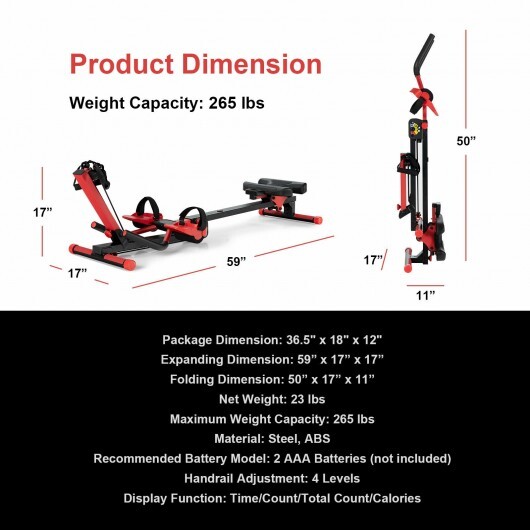 Specifications: Color: Black/Red Material: Steel ABS Expanding dimension: 59″ x 17″ x 17″ Folding dimension: 50″ x 17″ x 11″ Net weight: 23 lbs Weight capacity: 265 lbs Recommended battery model: 2 AAA batteries (not included) Handrail adjustment: 4 Levels Display function: Time/count/total count/calories Box Qty: 1(May vary by batch)Package includes: 1 x 4-in-1 Rowing machine 1 x User’s manual