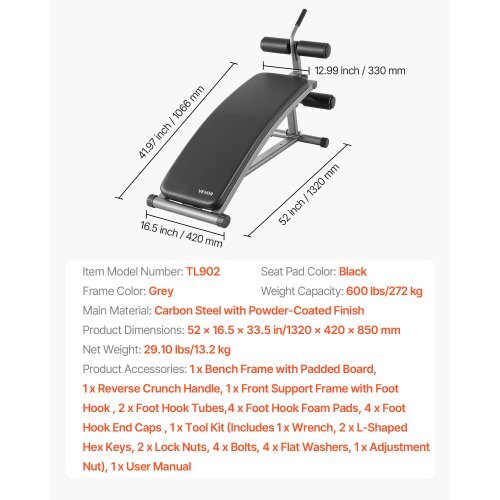 Seat Pad Color: Black,Frame Color: Grey,Weight Capacity: 600lbs/272 kg,Pad Dimensions: 41.97 x 12.99 in/1066 x 330 mm,ProductDimensions: 52 x 16.5 x 33.5 in/1320 x 420 x 850 mm,Net Weight:29.10 lbs/13.2 kg,Item Model Nmuber:TL902:,Main Material: CarbonSteel with Powder-Coated Finish