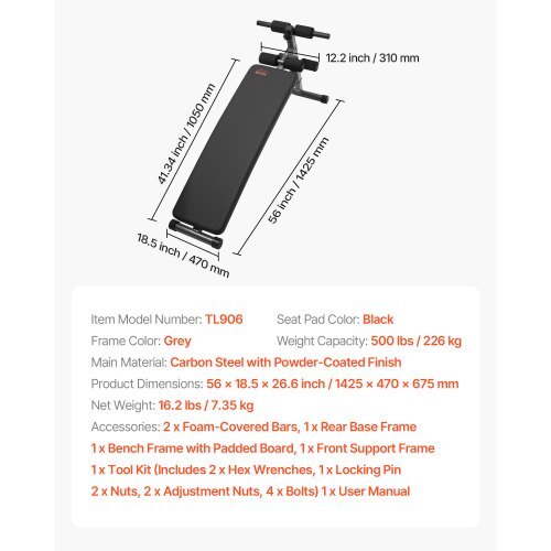 Seat Pad Color: Black,Frame Color: Grey,Item ModelNmuber:TL906:,Weight Capacity: 500 lbs/226 kg,Pad Dimensions: 41.34x 12.20 in/1050 x 310 mm,Product Dimensions: 56 x 18.5 x 26.6in/1425 x 470 x 675 mm,Net Weight: 16.2 lbs/7.35 kg,Main Material:Carbon Steel with Powder-Coated Finish